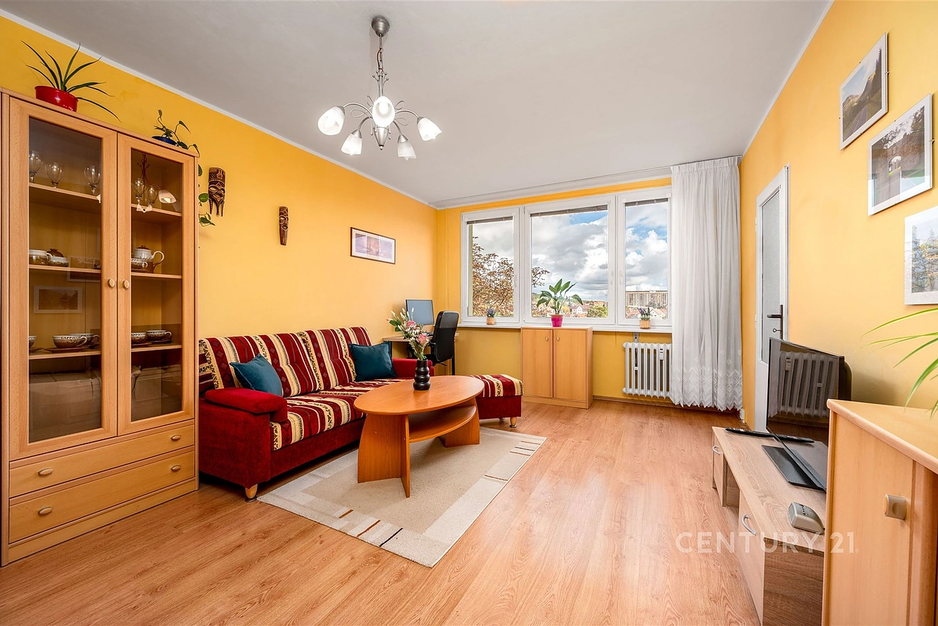 Díky velkým oknům je interiér bytu po celý den zalitý přirozeným světlem a nabízí příjemný, uklidňující výhled do okolní zeleně a vzrostlých stromů. Dispozice bytu je navržena s důrazem na funkčnost a pohodlí, kde hlavní obytný pokoj doplňuje samostatná kuchyň s jídelním koutem, což je benefit, který je v této kategorii bytů stále více ceněn.