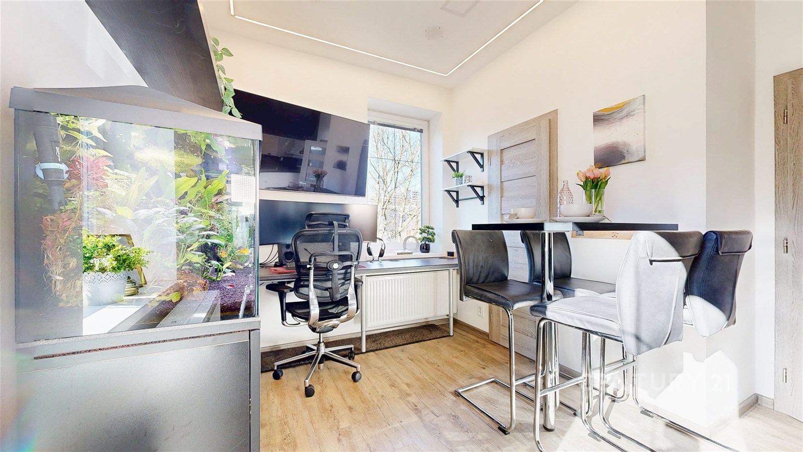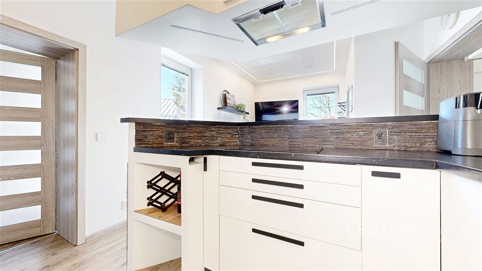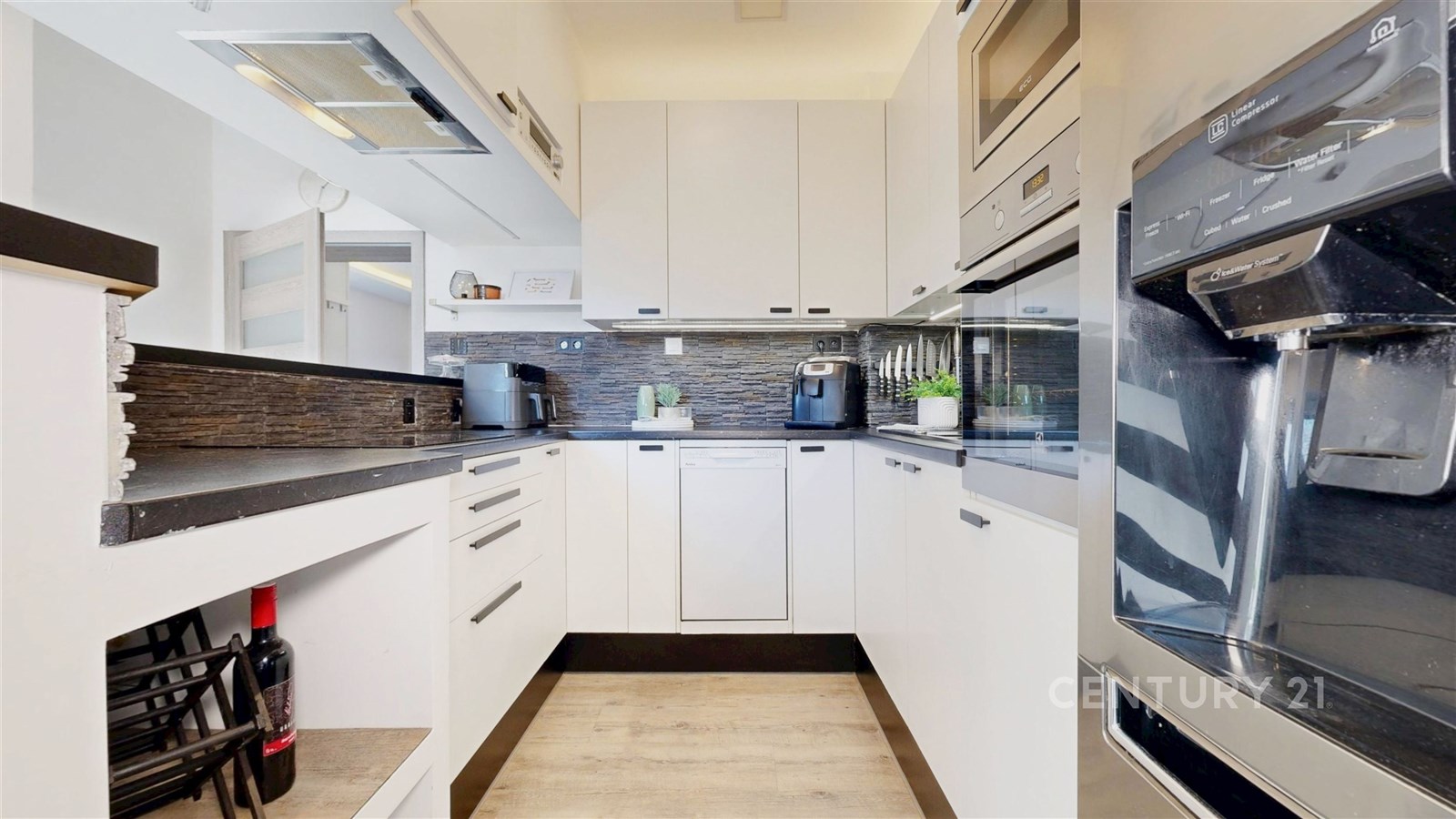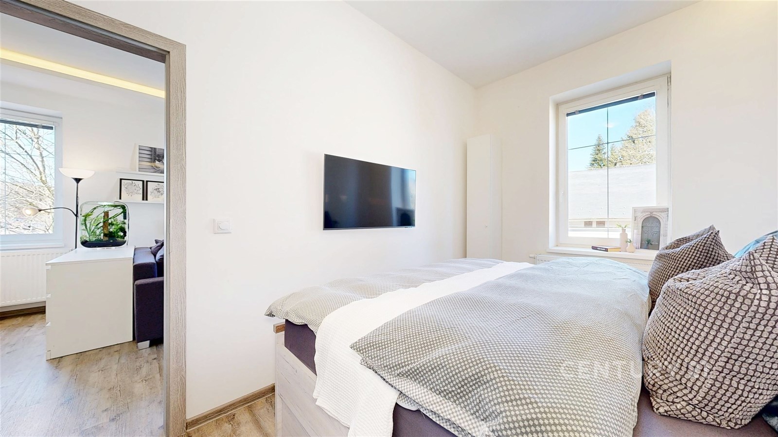 Dispozičně byt nabízí prostorný obývací pokoj se světlým interiérem a dostatkem místa pro relaxaci. Navazuje na něj moderní kuchyně s jídelnou – bílá linka s tmavou pracovní deskou, kamenným obkladem a barem vytváří stylový a funkční prostor. Kuchyň je navíc vybavena moderními spotřebiči, včetně myčky a mikrovlnné trouby. Vedle jídelního prostoru se také nachází pracovní kout. Ložnice je klidná, útulná a dobře osvětlená přirozeným světlem. Koupelna a samostatné WC jsou vybaveny prémiovým obkladem. V chodbě se nachází pračka se sušičkou. Byt je zařízen a je připraven k okamžitému nastěhování.