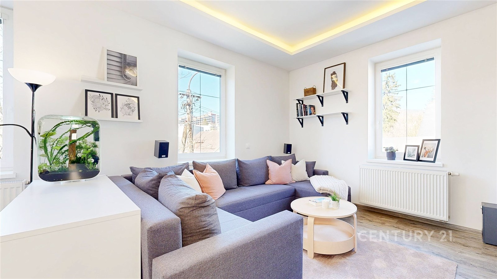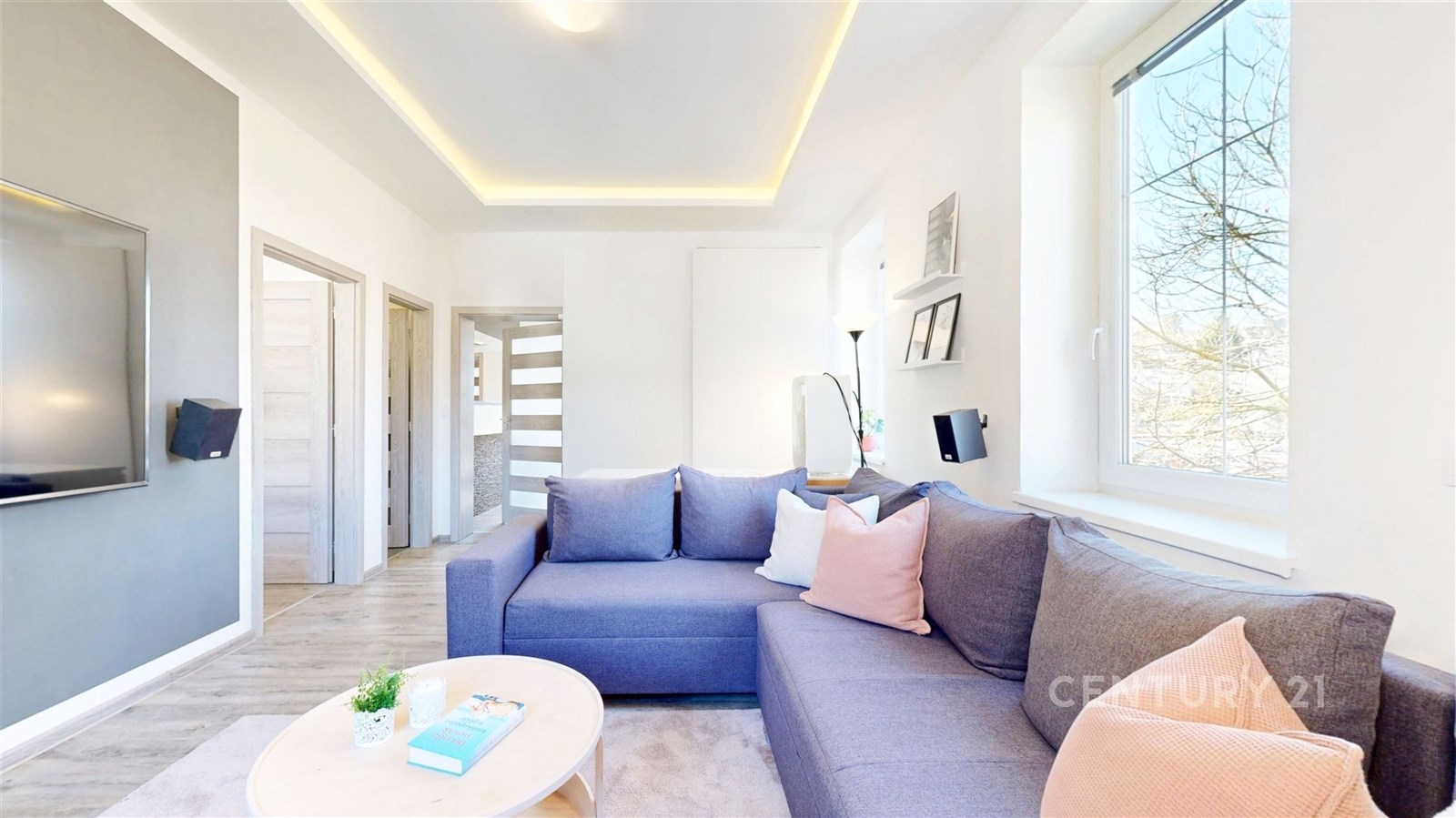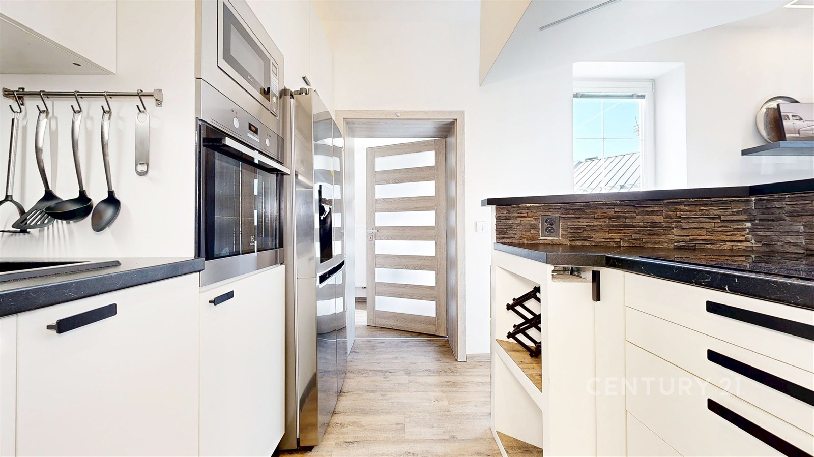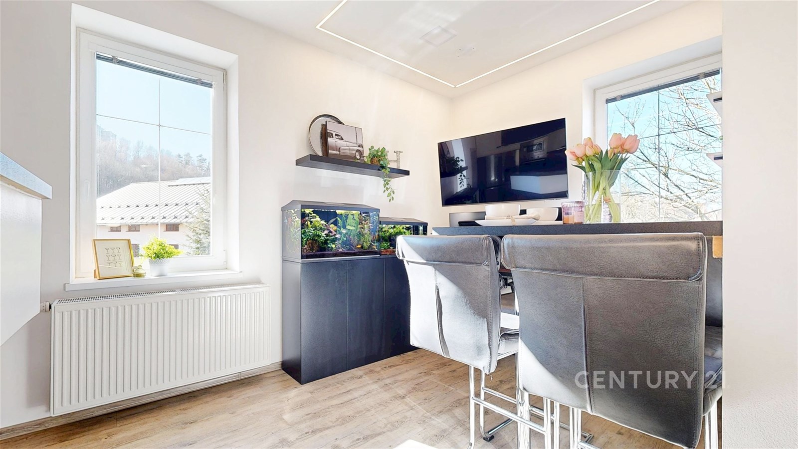 Dispozičně byt nabízí prostorný obývací pokoj se světlým interiérem a dostatkem místa pro relaxaci. Navazuje na něj moderní kuchyně s jídelnou – bílá linka s tmavou pracovní deskou, kamenným obkladem a barem vytváří stylový a funkční prostor. Kuchyň je navíc vybavena moderními spotřebiči, včetně myčky a mikrovlnné trouby. Vedle jídelního prostoru se také nachází pracovní kout. Ložnice je klidná, útulná a dobře osvětlená přirozeným světlem. Koupelna a samostatné WC jsou vybaveny prémiovým obkladem. V chodbě se nachází pračka se sušičkou. Byt je zařízen a je připraven k okamžitému nastěhování.