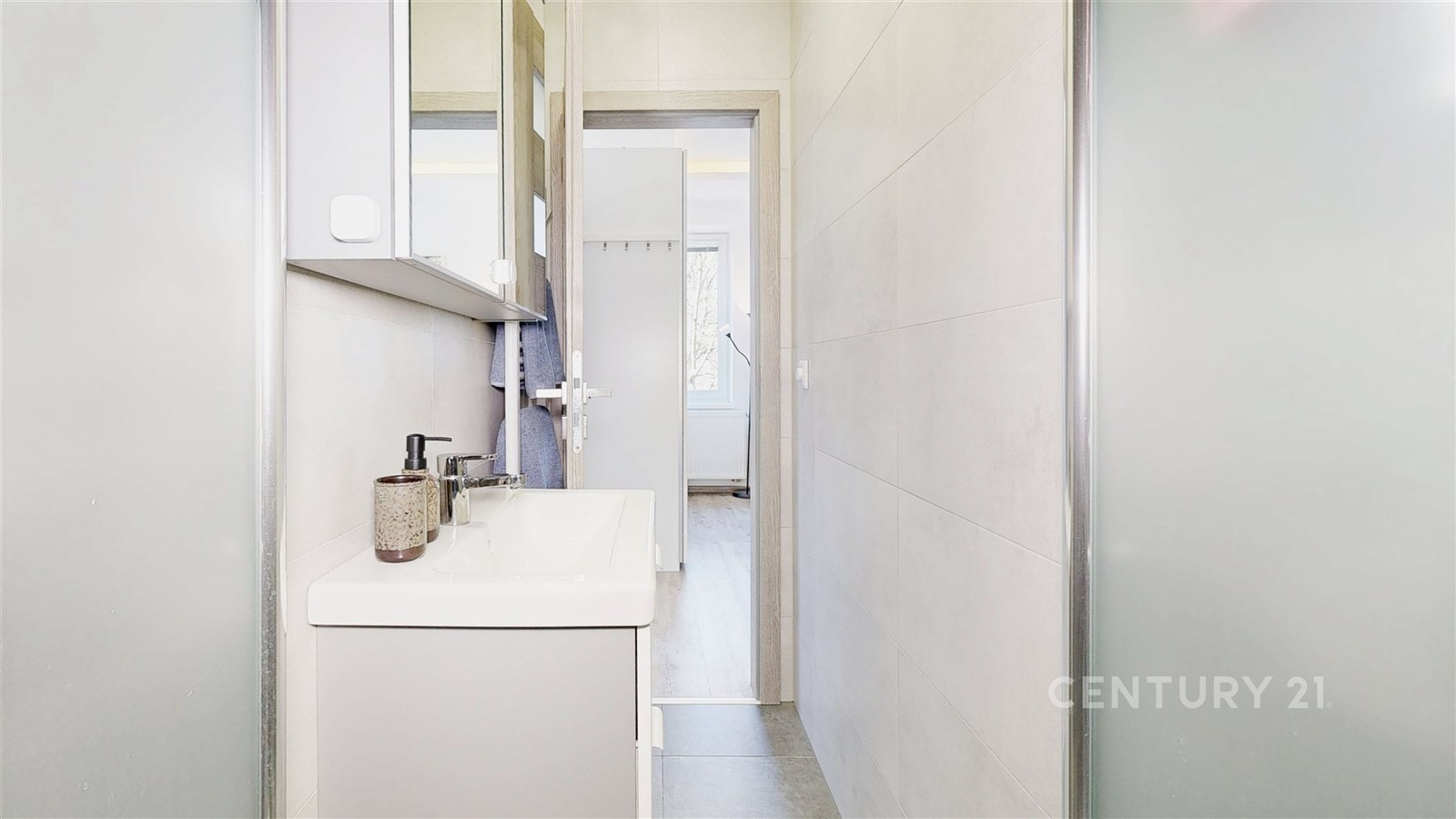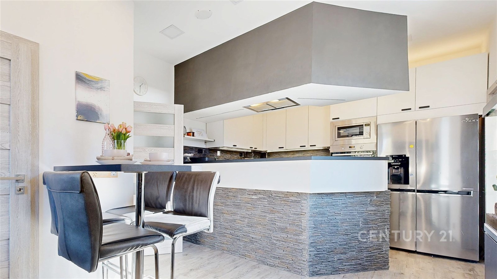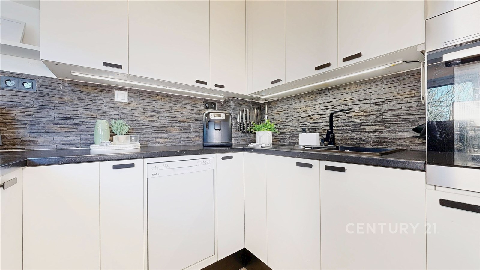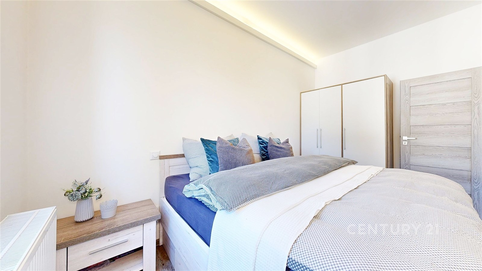 Dispozičně byt nabízí prostorný obývací pokoj se světlým interiérem a dostatkem místa pro relaxaci. Navazuje na něj moderní kuchyně s jídelnou – bílá linka s tmavou pracovní deskou, kamenným obkladem a barem vytváří stylový a funkční prostor. Kuchyň je navíc vybavena moderními spotřebiči, včetně myčky a mikrovlnné trouby. Vedle jídelního prostoru se také nachází pracovní kout. Ložnice je klidná, útulná a dobře osvětlená přirozeným světlem. Koupelna a samostatné WC jsou vybaveny prémiovým obkladem. V chodbě se nachází pračka se sušičkou. Byt je zařízen a je připraven k okamžitému nastěhování.