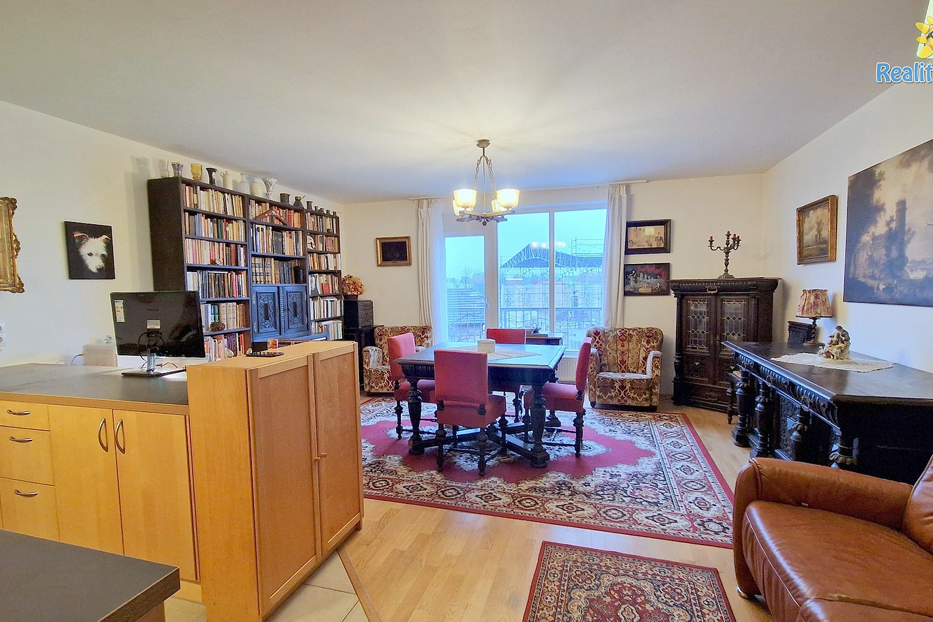 Byt se nachází v prvním patře s pěkným výhledem na Uhříněveský kostel. Skládá se z prostorného obývacího pokoje s kuchyňským koutem (32 m2), ložnice (19 m2), předsíně (5 m2), koupelny (5 m2), balkonu (5 m2) a sklepu (5 m2). Kuchyňská linka je s vestavěnými spotřebiči, elektrickou troubou, mikrovlnnou troubou a myčkou na nádobí. Ložnice je orientovaná na východ, obývací pokoj s balkonem na západ. V obou místnostech je velké třídílné francouzské okno.