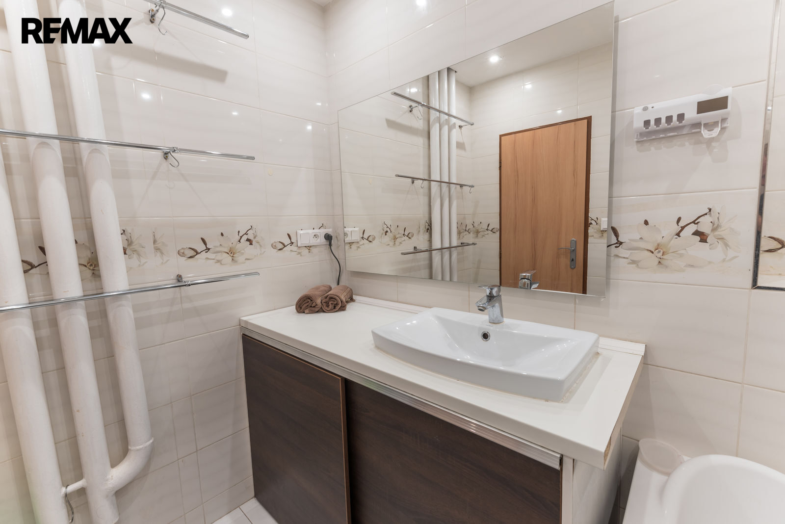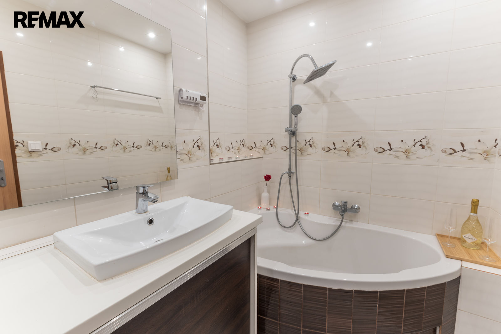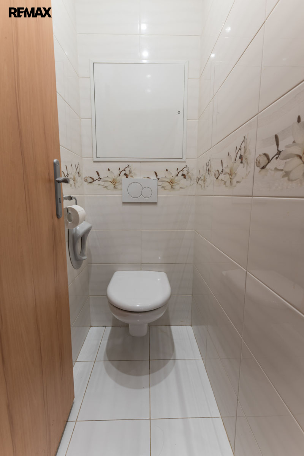 Koupelna je moderní, vybavena vanou, větším umyvadlem, ale také dostatkem úložných prostor, vedle nichž je i místo přímo pro pračku, nebo sušičku. Toaleta je samostatná.