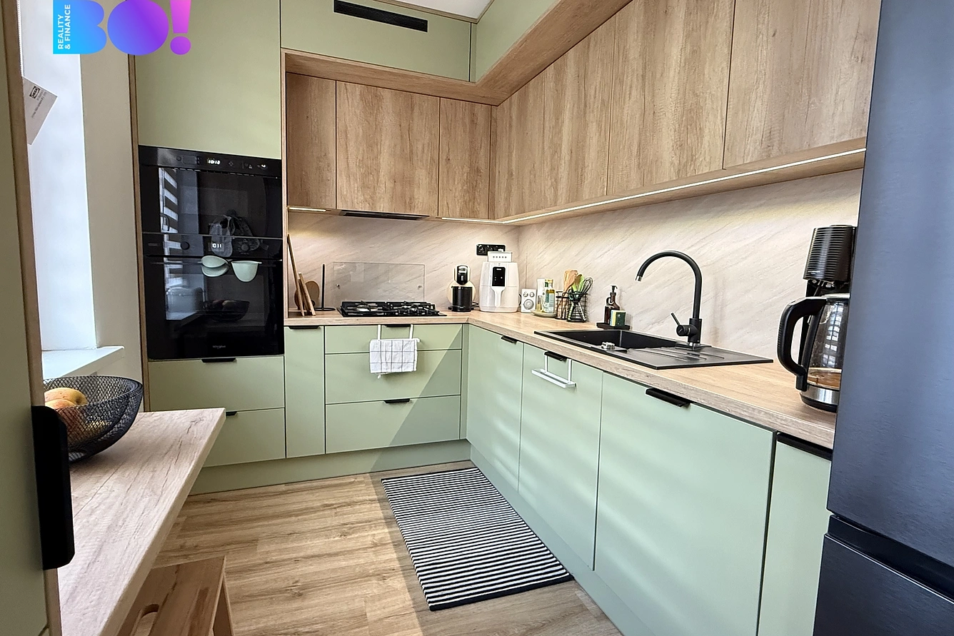 V bytě se prolínají barevně sladěné interiérové prvky zařízení. Čistý bílý design doplňují barevné tóny dřeva a jemně zelený - mátový odstín v kuchyni. Podlahy byly vyrovnány, izolovány a na povrchu je vysoce zátěžové linoleum evokující dřevěnou podlahu. Pocitově se jeví jako vinylová podlaha a pro domácnost s dětmi ideální. Okenní zastínění zajišťují rolety den a noc.