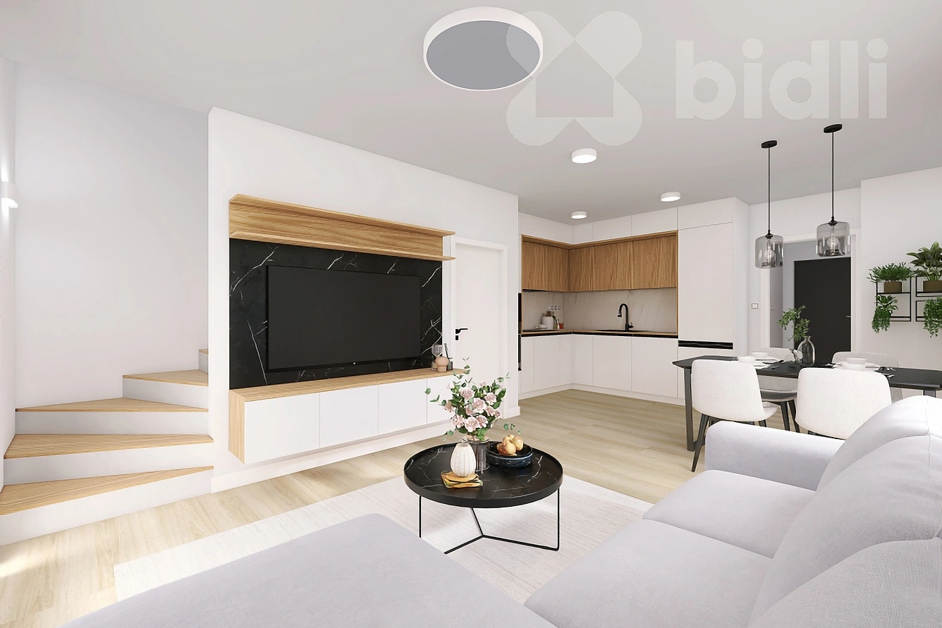 Dispoziční řešení bytu nabízí praktické a vzdušné uspořádání s důrazem na dostatek denního světla a propojení obytné části se zahradou. Mezonetové řešení přirozeně odděluje denní a klidovou zónu a přispívá k příjemné atmosféře rodinného bydlení.