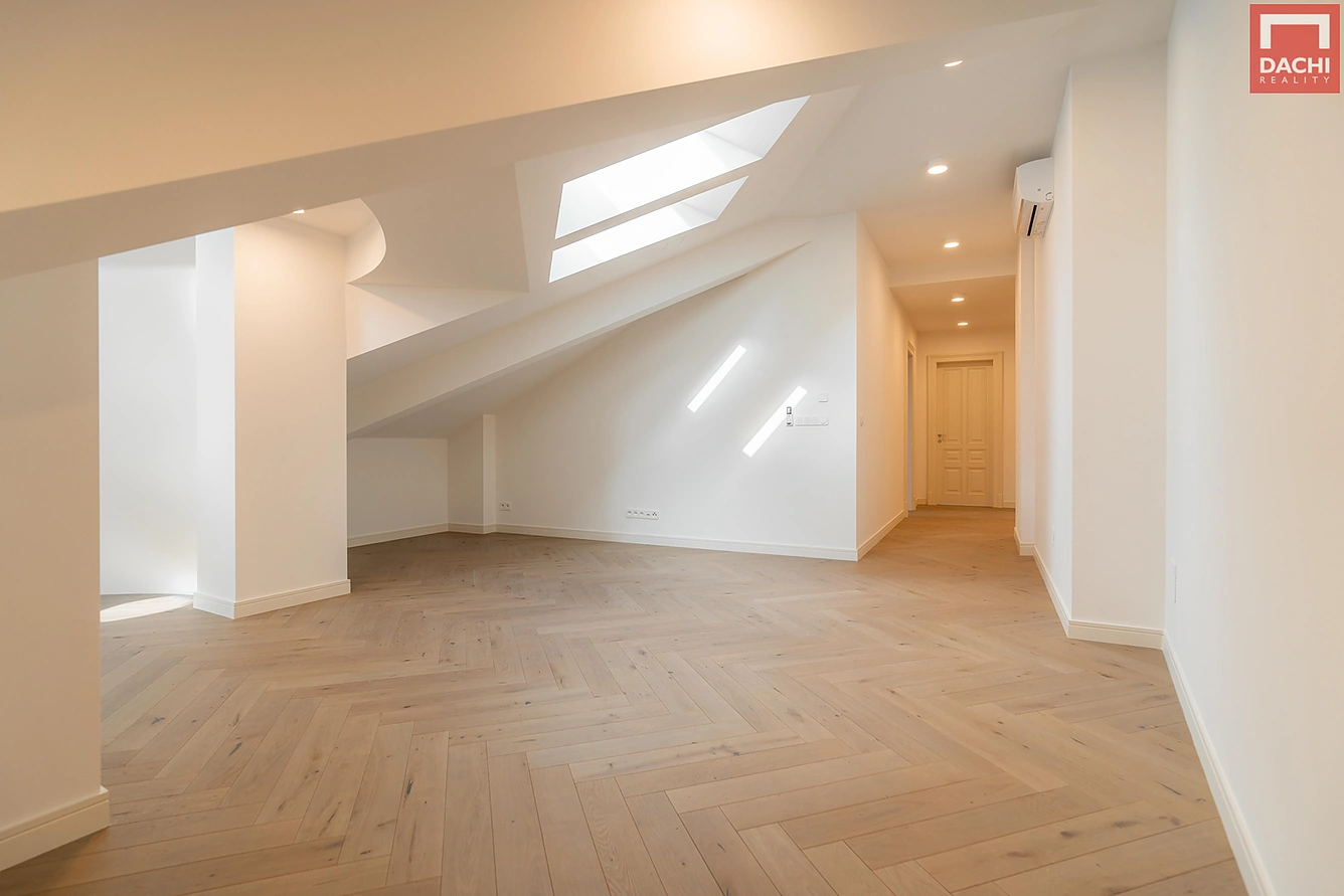 Byt je orientován na jihozápad, díky čemuž je během dne krásně světlý. Podkrovní okna zajišťují dostatek denního světla, které podtrhuje vzdušnost a jedinečnost celého prostoru. Dispozice je promyšlená a atmosféra bytu vyniká osobitostí, kterou nenajdete v žádné novostavbě. K bytu náleží také balkon o výměře 2,2 m², orientovaný do klidného vnitrobloku – ideální pro soukromé posezení. Samozřejmostí je také plně integrovaná klimatizace a elektrické žaluzie u stropních oken, které zajišťují maximální komfort a kontrolu nad světlem i teplotou interiéru.