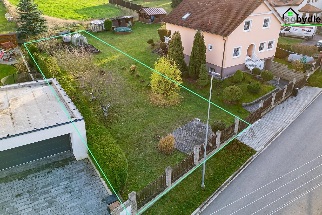 Upozornění: vyznačení hranic pozemku na fotografiích je pouze orientační, protože pozemek zatím není rozdělen.