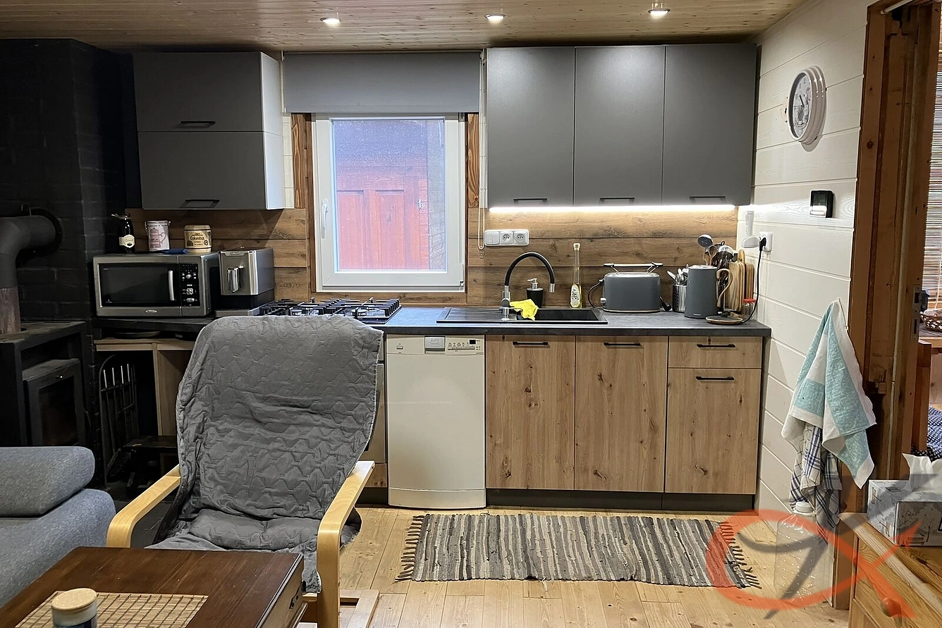 Vstup do chaty přes zádveří, ze kterého je vstup do průchozí obývací haly z ní do kuchyně s obývací části a dále do ložnice. Kuchyně vybavená novou kuchyňskou linkou s plynovým sporákem na propanbutan s horkovzdušnou troubou a myčkou.
