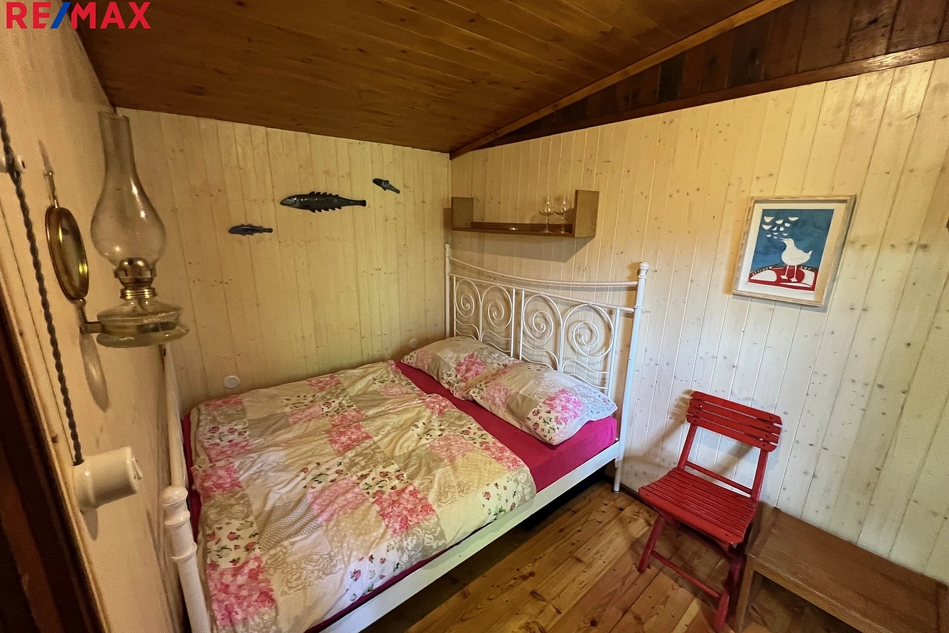 Romantický interiér nabízí obývací místnost s kuchyní a kuchyňskou linkou, stolem a židlemi, rozkládací gauč, krbová kamna. V pokoji se budete cítit jako u babičky, nebo jako na francouzském venkově... Manželská postel, obrázky, petrolejka, vůně přírody otevřeným oknem na terasu... Užitná plocha 25 m2, přivedena voda z IBC nádrže, na střeše solární panely s baterií a rozvodem po chatě na základní svícení a spotřebiče. U chaty je zbrusu nová latrína...