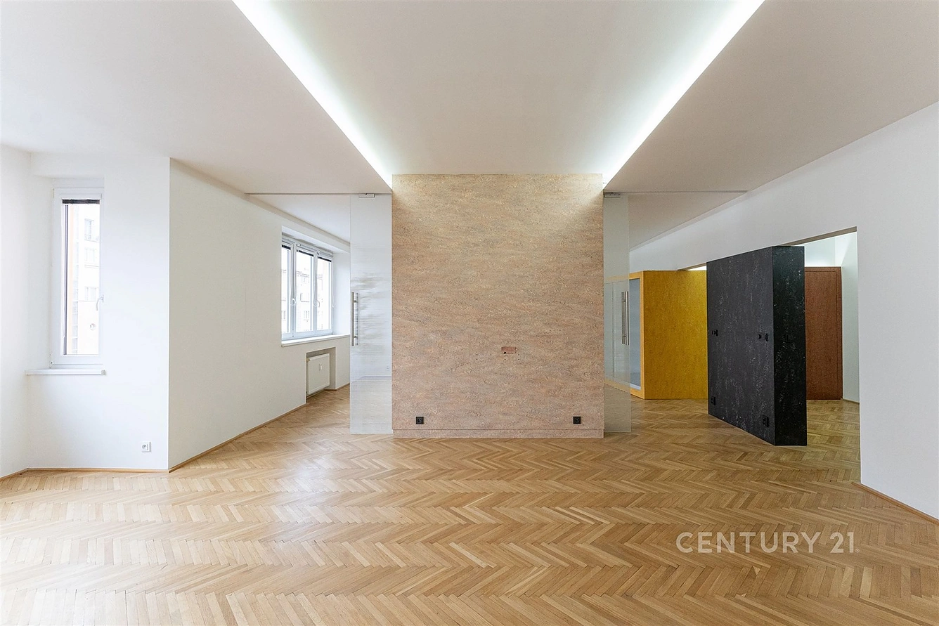 • Dva prosvětlené pokoje: 35 m2 a 22,5 m2, oddělené vestavěnými skříněmi a posuvnými prosklenými