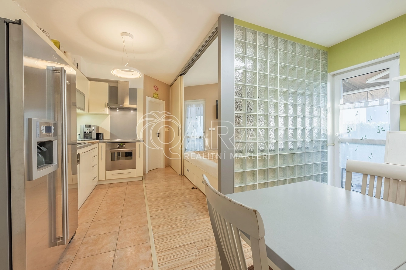 Vstupní chodba je vybavena vestavěnými skříněmi, které poskytují dostatek úložného prostoru. Koupelna disponuje sprchovým koutem, toaletou, dvěma umyvadly. Součástí vybavení je pračka i sušička. Kuchyňský kout s jídelní částí je řešen na míru a plně vybaven spotřebičemi – lednicí, sklokeramickou varnou deskou, troubou, mikrovlnnou troubou a kávovarem. Plynule navazuje na obytný prostor, který lze pomocí posuvných dveří oddělit a vytvořit tak samostatnou ložnici. Ložnice je dále oddělena designovou skleněnou příčkou z luxfer, která propouští denní světlo a zároveň zajišťuje maximální soukromí. Veškerý nábytek je vestavěný a navržen tak, aby byt bylo možné ihned plnohodnotně užívat bez nutnosti dalšího zařízení. Další pokoj, rovněž vybavený vestavěným nábytkem, je ideální jako dětský pokoj. K bytu náleží také zasklená lodžie o velikosti 4 m², která sloužila jako klidná pracovna. Na lodžii je instalována klimatizační jednotka, která v letních měsících byt příjemně ochladí a v zimě umožňuje přitápění, což výrazně zvyšuje komfort bydlení po celý rok.