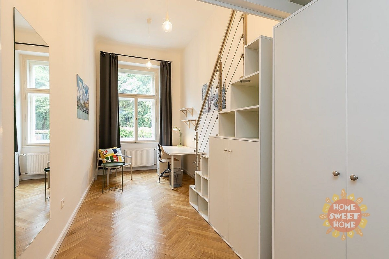 Nabízíme krásný, plně zařízený pokoj o velikosti 12 m² s patrem na spaní, který se nachází v 1. patře cihlového domu v rezidenci Kinských na náměstí Kinských, Praha 5. Dům prošel kompletní rekonstrukcí v roce 2019. Pokoj je součástí čtyřpokojového bytu s plně vybavenou kuchyní, jídelním koutem, dvěma koupelnami a samostatnou toaletou. Společné prostory jsou kompletně vybaveny včetně žehličky, úklidových pomůcek a dalších potřeb pro běžný provoz. Samotný uzamykatelný pokoj je vybavený pracovním stolem, šatní skříní, přikrývkou a polštářem. Internet a úklid společných prostor (1× týdně) jsou již zahrnuty v ceně nájmu. Nájemníkům je dále k dispozici fitness, prádelna (na mince) a společná terasa.